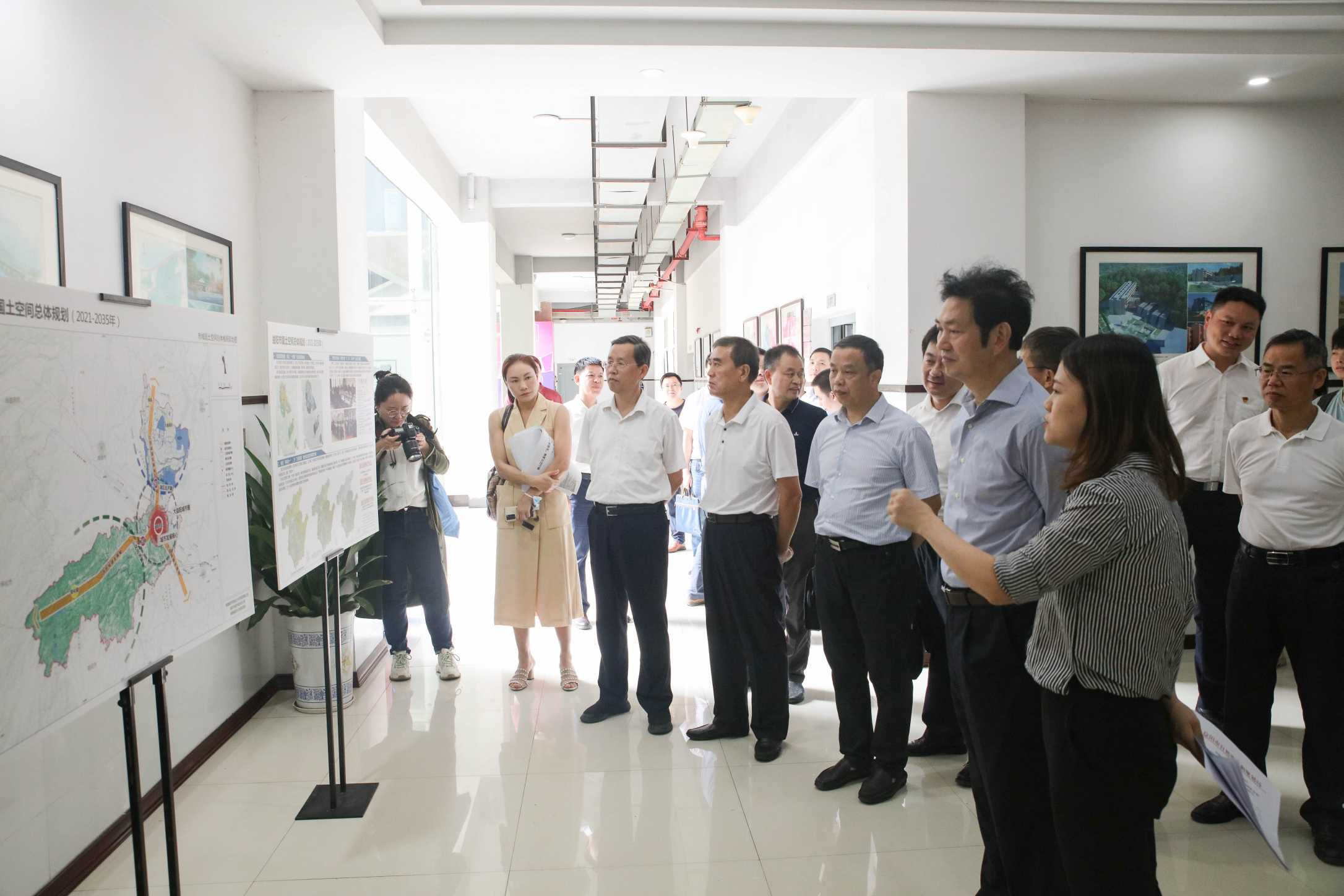 陈仲伯一行首先参观了益阳市国土空间总体规划和试点村庄规划成果展览,详细听取了情况汇报,深入了解了益阳市城市发展战略、城市发展方向和三条控制线划定情况。随后,益阳市人民政府副市长胡安邦主持开展调研座谈会,省自然资源厅空间规划局、执法局、耕保处、办公室,益阳市人民政府,益阳市自然资源和规划局,学校产业发展管理处、科研处、建筑与城市规划学院的相关领导和专家,以及设计院相关部门负责人参加会议。
