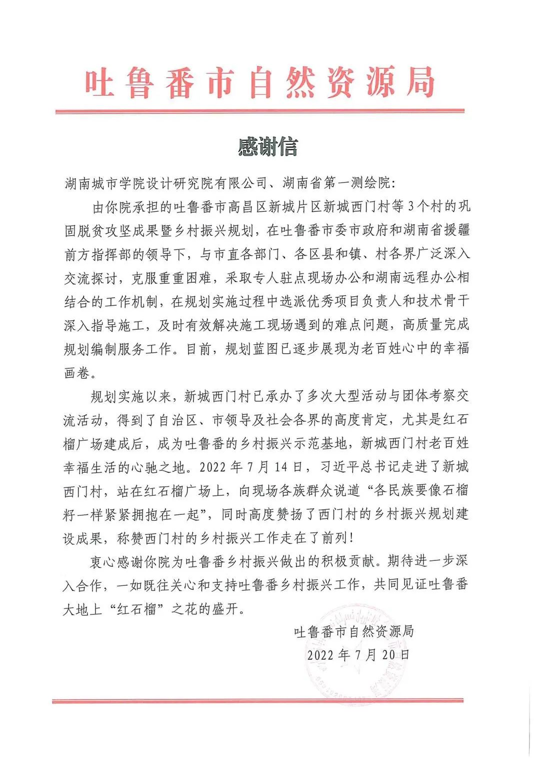 “衷心感谢你院为吐鲁番乡村振兴做出的积极贡献。期待进一步深化合作……共同见证吐鲁番大地上‘红石榴’之花的盛开。”近日,我校设计院收到吐鲁番市自然资源局的一封感谢信,字里行间表达对设计院承担吐鲁番市高昌区新城片区西门村等三个村乡村振兴规划编制工作所产生的积极成效、突出贡献的真挚感谢。