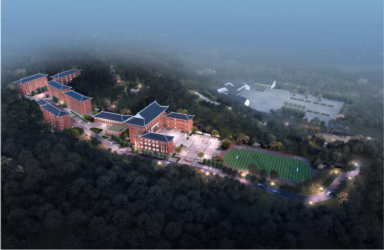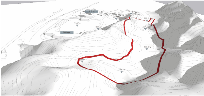 基于山地现状和净用地范围的狭长,我们的设计将现状原有的山间小路拓宽加长,与西北侧的游客中心服务广场相连。建筑沿着道路两侧布置,顺应地形,设置台地,或者局部架空。大致分为三个区域:运动场地、教学办公区、生活服务区。通过道路将三个片区联系起来,形成一个整体。展现党政教育与革命老区小城复兴的复合型党性教育基地。
