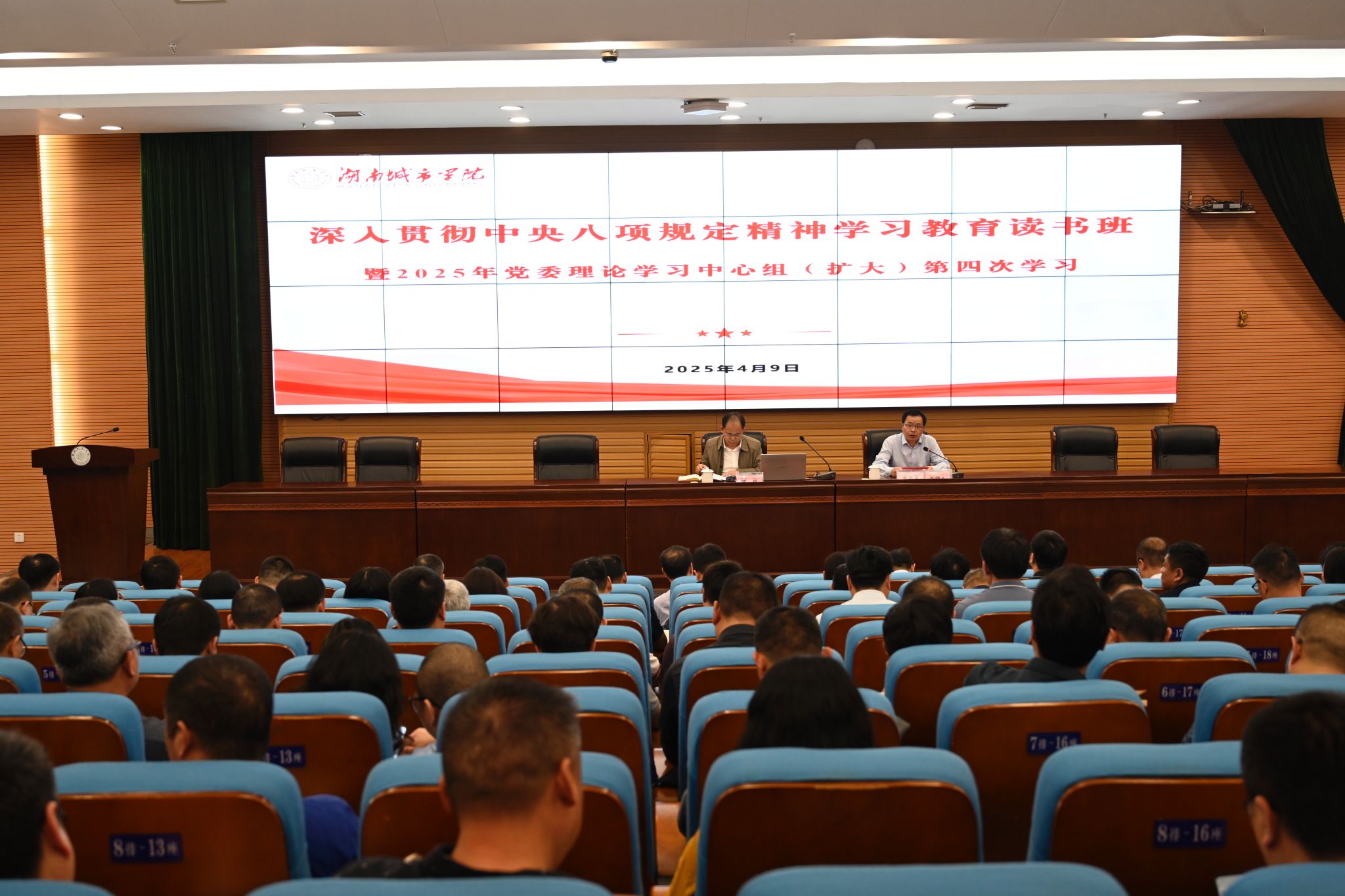 本网讯(通讯员 李玉洁)4月9日下午,学校深入贯彻中央八项规定精神学习教育读书班暨2025年党委理论学习中心组(扩大)第四次学习在图书馆报告厅举行,党委副书记、校长何振等在家校领导出席,党委副书记袁志成主持。