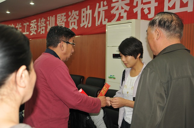 会议现场,学校关工委、离退休党总支代表现场向来自14个二级学院的优秀特困学生进行了捐款。