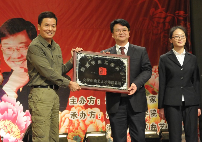 周卫星在湖南省曲艺家协会向华体会在线(中国)唯一官方网站授予“大学生曲艺人才培养基地”的仪式上说:“我们希望能发现优秀曲艺人才,认真合作,着力培养,为发展湖南曲艺事业,弘扬优秀传统文化做出贡献。”汤放华和学生代表马丹丹等代表学校接受牌匾,我校由此开始成为了省曲协的人才培养基地。