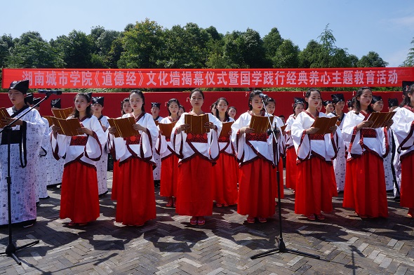 在世界上迄今为止最长的《道德经》文化石墙前,文学院学生身着汉服,手持竹简,双手作揖,表演古代礼仪,齐声诵读《道德经》第123、789章,拉开了活动的帷幕,并深深吸引和感染参加活动每一个人。
