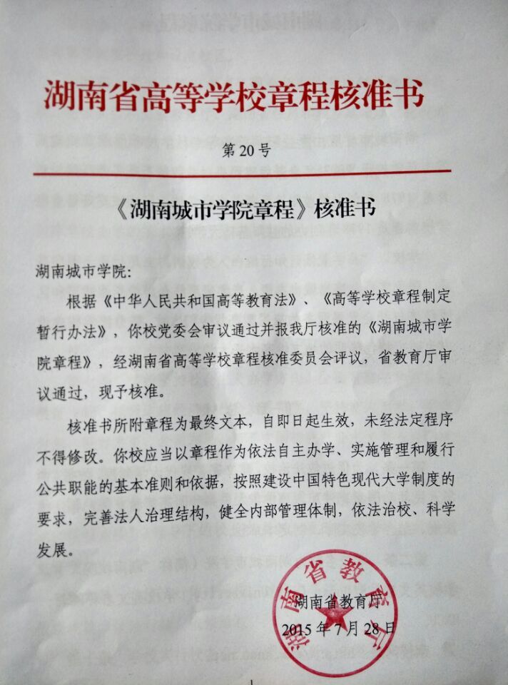 (本网讯)经湖南省高等学校章程核准委员会评议, 7月 28日 ,湖南省教育厅审议通过了《华体会在线(中国)唯一官方网站章程》,章程于核准之日起正式生效。