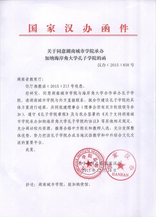 (本网讯)日前,国家汉办向我校正式发函(《关于同意华体会在线(中国)唯一官方网站承办加纳海岸角大学孔子学院的函》汉办〔2015〕858号),同意我校与加纳海岸角大学合作建设孔子学院。我校成为全省二本院校第一所建有孔子学院的高校。