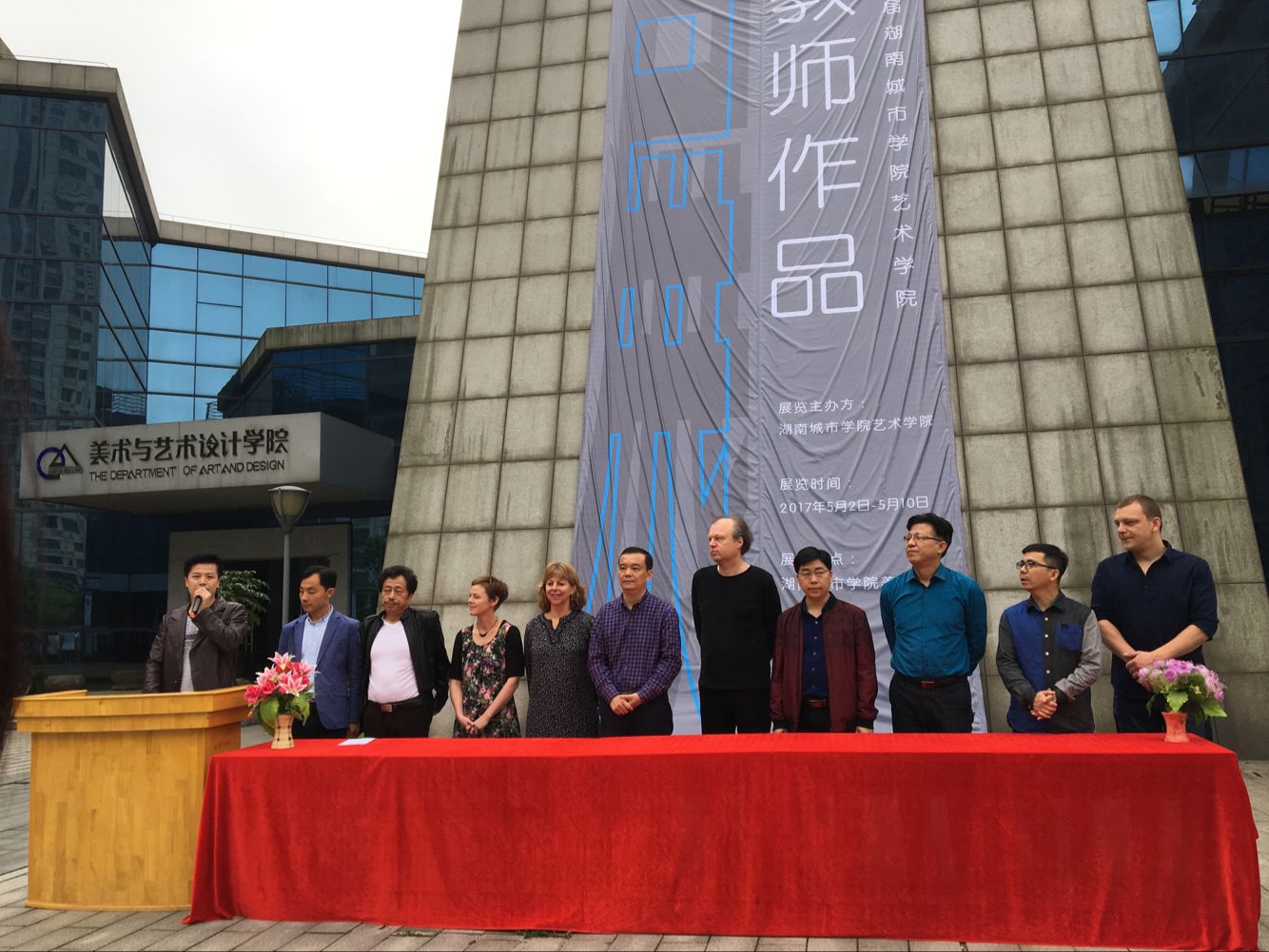 (本网讯)5月2日上午9点,艺术学院第三届教师美术作品展在美艺楼前坪隆重开幕。副校长雷存喜、教务处负责人,益阳市美术家协会主席袁庆典,副主席欧阳波、罗剑,湖南工艺美术职业学院装饰艺术系主任李升、党总支书记张晓安以及艺术学院来自德国、新西兰的外教老师等嘉宾参加了此次展览的开幕式。