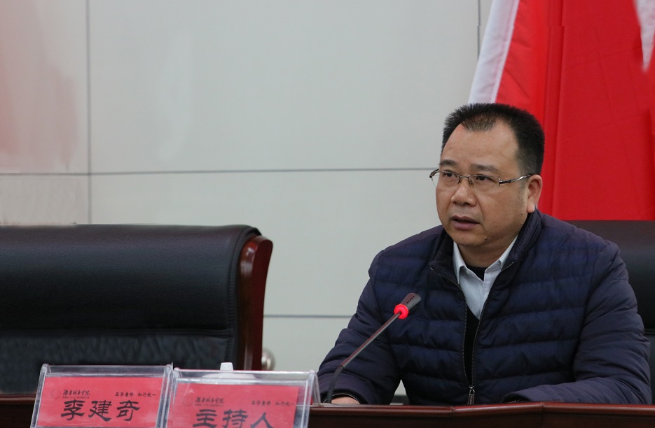 (本网讯)1130日下午,学校2017年党委中心组(扩大)第六次学习在图书馆报告厅举行。党委书记罗成翼就全面深入学习贯彻党的十九大精神为师生代表作辅导报告。校领导李建奇、汤放华、夏宏宇、姚春梅、郑卫民、刘辉煌、何振、雷存喜、谭献良、范志超出席会议。全校处级以上党政干部、各二级学院党委(总支)书记、各基层党支部书记、全体辅导员及马克思主义学院全体教师等400余人参加会议。报告会由校长李建奇主持。