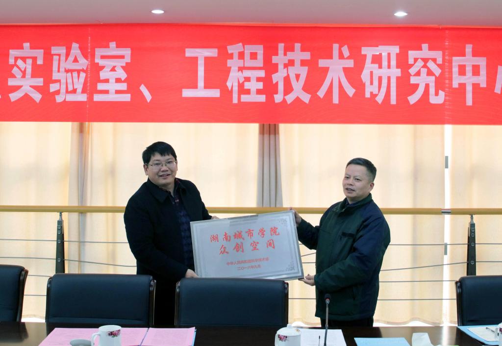 (本网讯)12月22日下午,省科技厅副厅长贺修铭、科研条件与基础研究处处长彭敬东、益阳市科技局副局长欧小娥一行来校,为我校获批的国家级众创空间、湖南省重点实验室、工程技术研究中心授牌,并参加省重点实验室学术委员会会议。在家的校领导,各二级学院院长,党政办、宣传部、科研处、教务处、质控中心负责人参加会议。会议由校长李建奇主持。