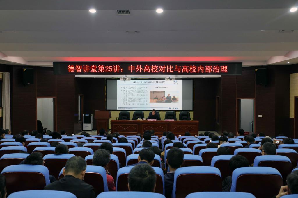(本网讯)4月13日下午3:10,德智讲堂第二十五讲在建规楼学术报告厅开讲。南华大学党委书记王汉青教授应邀来校,以“中外高校对比与高校内部治理”为题作了一场生动的辅导报告。在家的校领导出席了报告会,机关处室科级以上干部、二级学院书记和院长参加了报告会,会议由党委书记罗成翼主持。