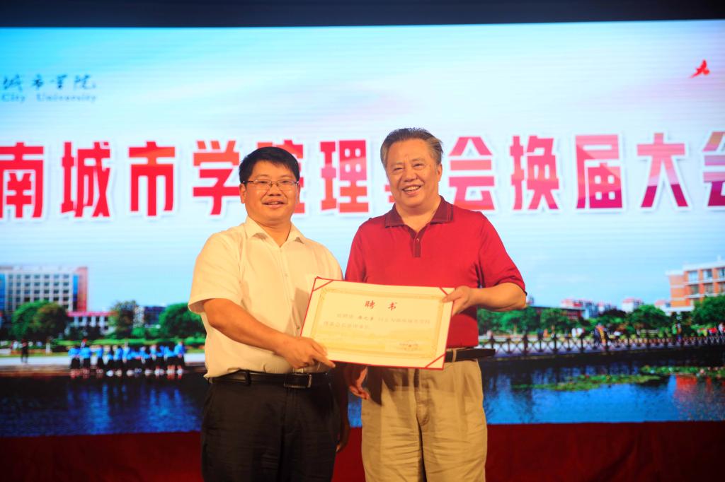 罗成翼为我校理事会名誉理事长唐之享、名誉副理事长原华体会在线(中国)唯一官方网站党委书记李新国、赵运林颁发聘书。