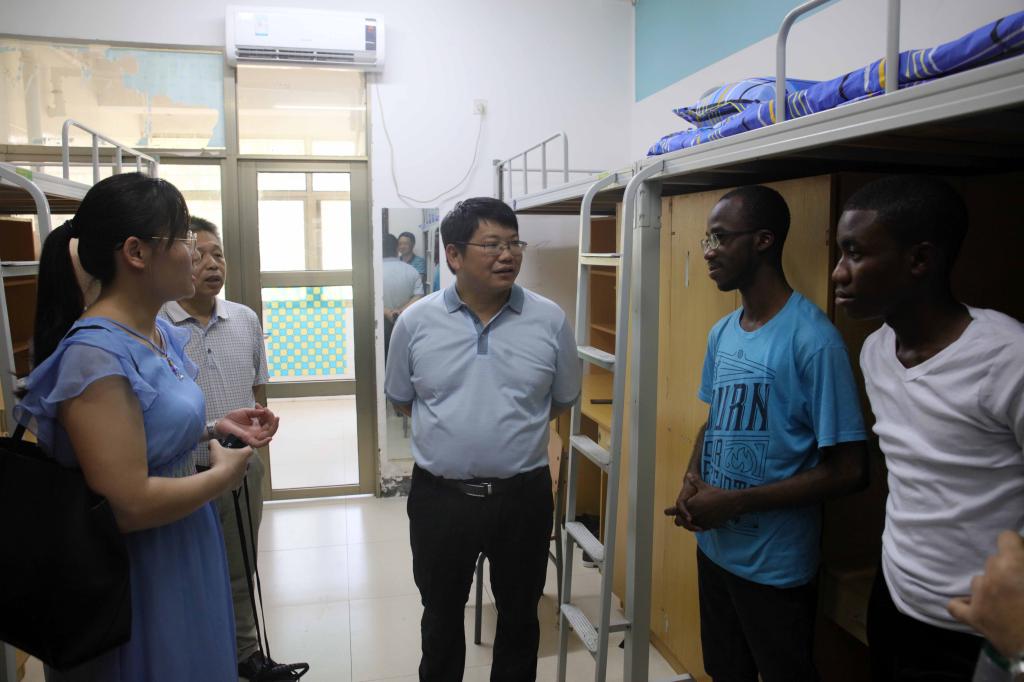 在学生宿舍15、16栋,罗成翼在国际合作与交流处负责人的陪同下,看望了刚刚从非洲远道而来参加在我校举办的孔子学院夏令营的加纳学子,并与他们合影留念。