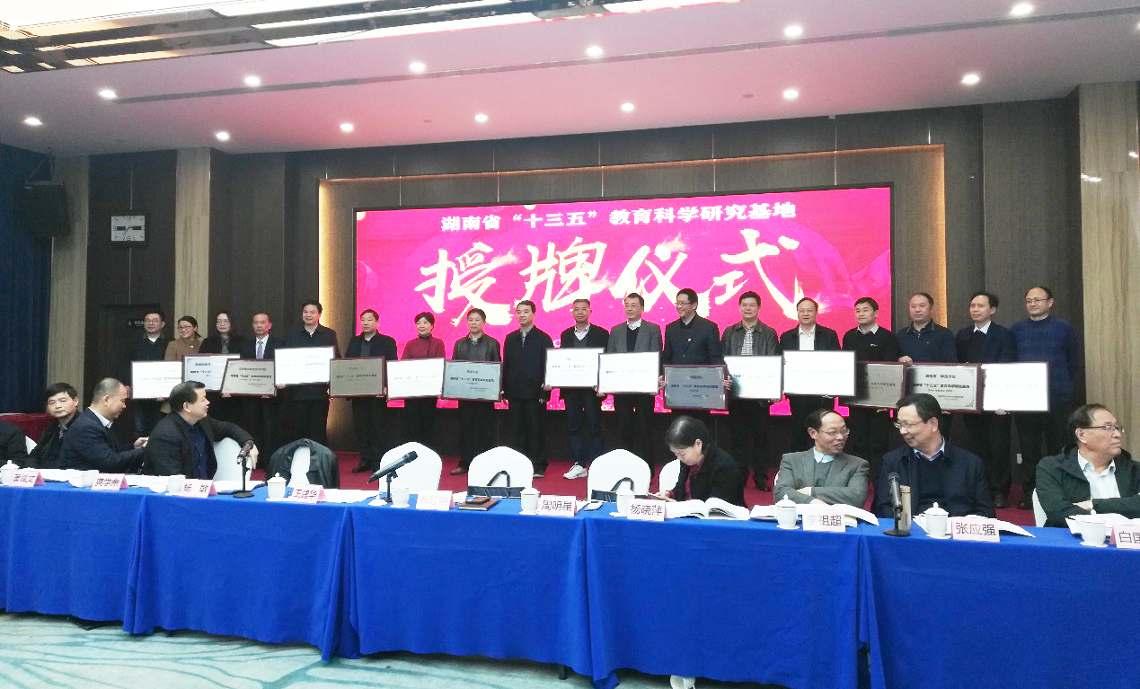 省教育科学研究院院长、省教育科学规划领导小组副组长兼规划办主任石灯明宣读了《关于确认湖南大学等15个单位为“湖南省‘十三五’教育科学研究基地”的通知》。省教育厅党组成员、省委教育工委副书记、省教育科学规划领导小组副组长王建华为15个研究基地首席专家授牌并与研究基地一一签订研究基地建设责任书。