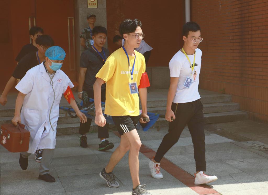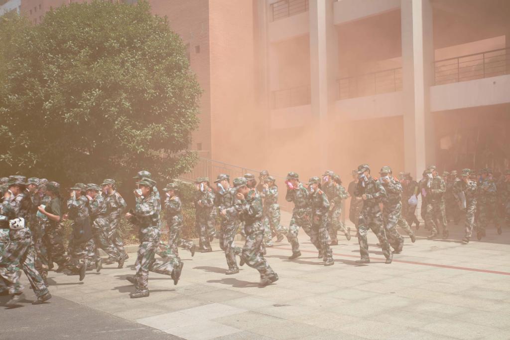 12时30分,夏宏宇下达了演习开始的命令。工作人员在第二教学楼点燃了烟雾弹,很快,橘红色的烟雾在整栋楼蔓延开来。当火警警报响起后,5000多名新生在义务消防员的指引下弯着腰,用随身携带的湿毛巾捂住口鼻,沿着应急疏散通道快速撤离到安全地带。