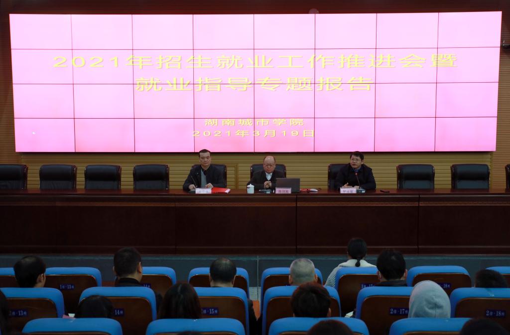 本网讯  2021年3月19日下午,学校在图书馆报告厅召开2021年就业工作推进会,并举办2021年第一期就业指导专题报告会。党委书记罗成翼出席会议并讲话,他要求就业部门和各学院打出就业服务“组合拳”,努力实现毕业生更高质量和更充分就业。湖南信息职业技术学院院长陈剑旄作“结构化面试策略与方法”的就业指导专题报告