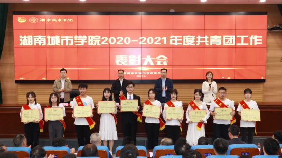 李建奇发表讲话,他代表学校党委、行政向受到表彰的先进集体和先进个人表示热烈的祝贺,向全校青年师生致以美好的祝愿。他指出,2020年学校获批湖南省“三全育人”综合改革试点高校,列入湖南省本科一批招生,推荐成为2020年新增硕士学位授予单位,实现了几代城院人的梦想。他深情寄语广大团员青年:站在“两个一百年”的历史交汇点、面向学校新的跨越发展的关键时期,广大青年对五四精神的最好传承,就是在党的领导下,勇做走在时代前列的奋进者、开拓者、奉献者。一要坚定理想信念。从革命时期的青年豪杰到如火如荼建设时期的雷锋,从牺牲在脱贫攻坚一线的“第一书记”黄文秀到抗疫期间勇敢逆行的80后、90后医护人员,从23岁就读大三期间就破解了困扰数学界20多年难题“西塔潘猜想”的中南大学刘路,到我校扎根新疆基层建设的2018届毕业生董振昊、湖南省抗疫“优秀青年突击队员”2019届毕业生杨建国,先进青年从来都是党和人民事业发展的生力军和突击队。广大团员青年要始终坚定理想信念,矢志践行初心使命,始终做到与祖国同心同向、同向同行、同行同力。二要锤炼品德修为。在建党100周年之际,全国上下、全校上下都掀起了党史学习教育的热潮,作为新时代的大学生,要自觉投身党史学习,重温党的光辉历史,在党史学习中明大德、守公德、严私德。我校历来重视学生的文明养成教育,注重从公共文明、教室文明、宿舍文明、网络文明等方面全面提升同学们的文明素养,营造良好的校园文明环境,同学们要加强思想道德修养,保持积极的人生态度和良好的道德品质,努力做中华民族传统美德的传承者、新型人际关系和良好社会风尚的倡导者,使“道德文明之风”深入人心。三要练就过硬本领。青年时期是苦练本领、增长才干的黄金时期,当今时代,知识更新不断加快,新技术、新模式、新业态层出不穷,这既为青年施展才华、竞展风采提供了广阔舞台,也对青年能力素质提出了新的更高要求。希望同学们对标“一本”培养目标,立足“两个大局”,心怀“国之大者”,着眼湖南 “三高四新”和益阳“东接东融”战略需求,适应专业认证的产业导向、学生中心要求,变被动机械学为主动创新学,真正做到“品学兼修,知行统一”,为国家富强、民族复兴、人民幸福贡献自己的青春和汗水,用实学实干去成就未来。