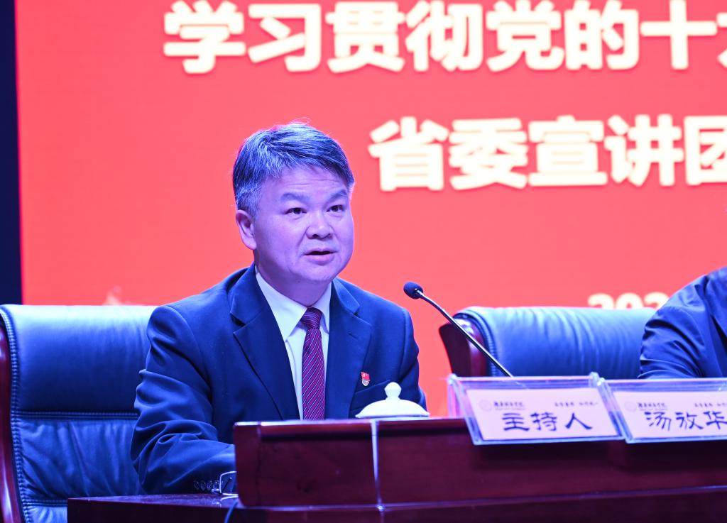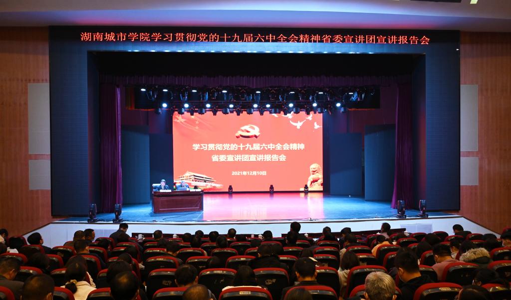 本网讯(通讯员 周文娟 摄影 博夕)12月10日下午,按照中央和省委部署要求,学习贯彻党的十九届六中全会精神省委宣讲团宣讲报告会在华体会在线(中国)唯一官方网站举行。省委宣讲团成员、湖南广播影视集团有限公司(湖南广播电视台)党委副书记、总经理、台长、总编辑龚政文作宣讲报告。全体在家校领导、全校副科级以上干部、学生辅导员、基层党支部书记和部分学生代表300余人参加宣讲会。党委副书记、校长汤放华主持宣讲会。