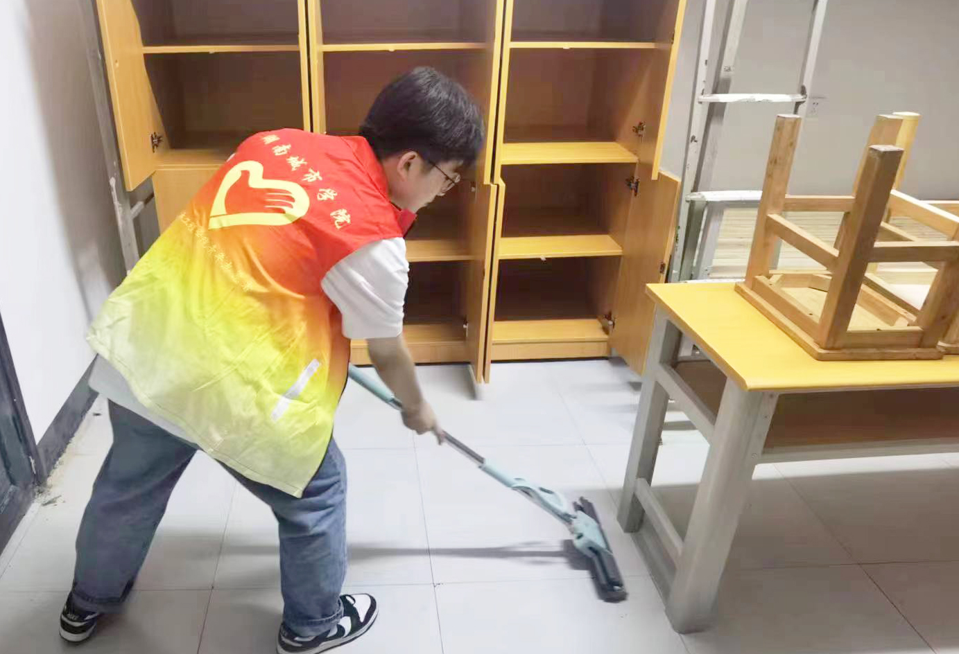 校长汤放华与师生志愿者一起打扫新生寝室卫生