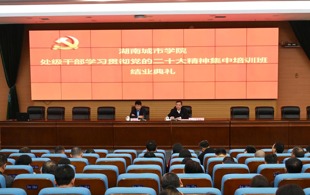 本网讯(通讯员 刘淑莉)3月18日,我校在图书馆报告厅举行“学习贯彻党的二十大精神处级干部培训班”结业仪式。学校党委书记汤放华出席结业仪式并讲话,党委委员、组织部部长吕贤军主持。在家的校领导以及处级以上领导干部参加结业仪式。