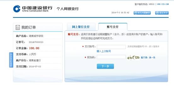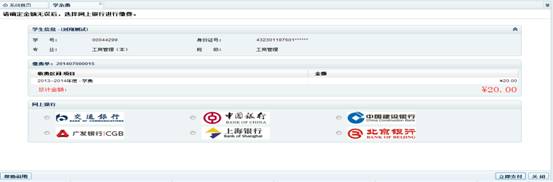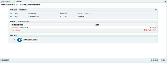 注:根据学校与银行的协议,我校学生在自助缴费系统中将按一定比率分配至建设银行与交通银行,同时为保证每个学生现有的银行卡都可以使用该系统,“支付确定页面”除了出现“建设银行”或者“交通银行”网上支付图标外,还设置了其他银行的图标(近期内将扩展到几个主要银行),持有其他银行卡的同学也可选择进行支付,所有网上银行支付发生的跨行手续费,都不会由学生承担。目前本系统暂不支持信用卡支付。