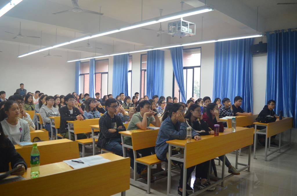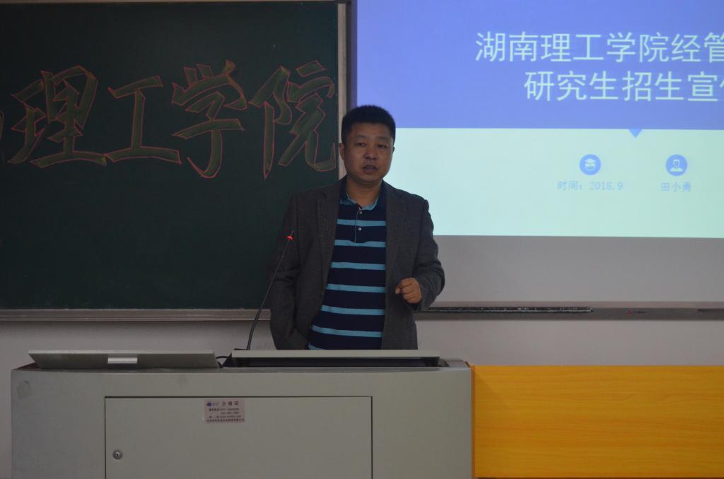 首先,管理学院分团委书记李姗对活动做简要介绍,并邀请湖南理工学院田小勇教授上台演讲。然后,田小勇教授简述了湖南理工学院的基本概况,他邀请同学们观看校园介绍视频,其主要记录了湖南理工学院的校园环境特点,也再现了部分学院学生认真学习的场景。视频的结尾提到学校对全体学生的殷切期望,并希望同学们认真领会“至善穷理,秉诚前进”的精神。紧接着,田教授重点介绍了学校经管学院的师资力量和学院的三个硕士点单位:应用经济学硕、会计学硕和旅游管理专硕,详细讲解三个硕士招生的主要研究方向和招生考试科目。最后,田教授提到该院充足的经费支持和研究生奖励,号召大家不忘初心,砥砺前行,坚持梦想,同时结合自身实际,把握机会,为国家做出贡献。至此,湖南理工学院的硕士点招生活动圆满结束。
