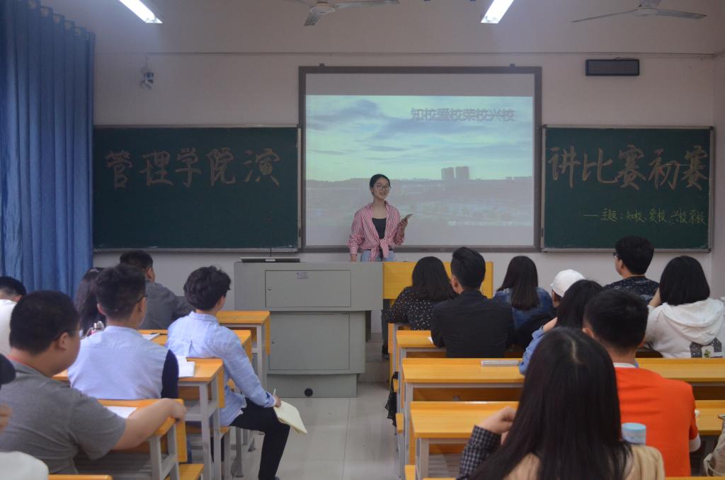 2018年4月1日14:00,管理学院演讲比赛初赛于管理楼307、308正式举行。本次演讲比赛的主题是“知校、爱校、兴校、荣校”,管理学院各班派代表积极参与本次比赛。出席本次比赛的评委有管理学院学生会主席李志俊,学生会主席团叶立梅、颜茁、魏姣姣、刘佳旺、王洛桐,校团委、学生会办公室主任刘林沐,辩论队优秀辩手蒋玉晟、冯茜、姚泽林、杨艳,以及管理学院演讲辩论队副队长周书婷。