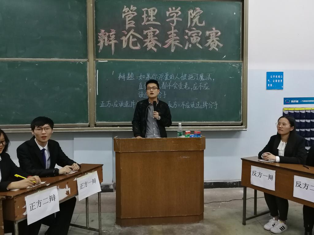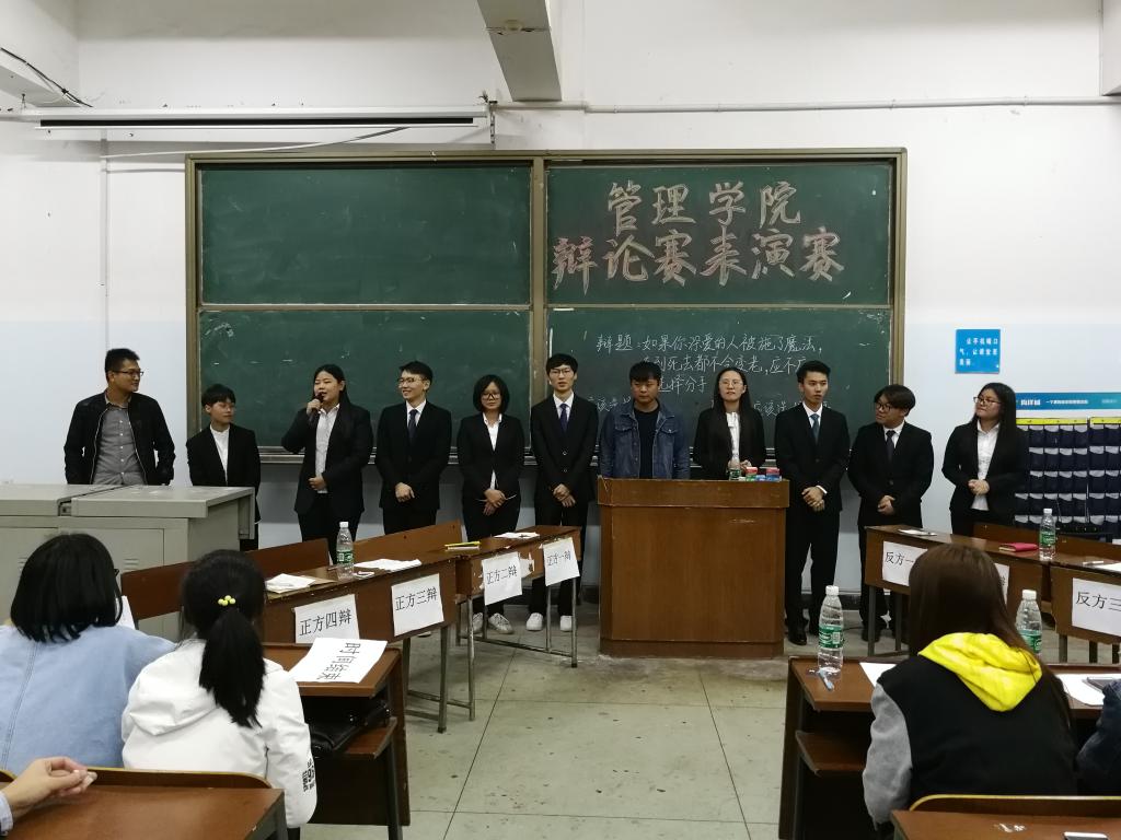 由管理学院主办的辩论表演赛于2017年10月13日晚上7:00在一教408和一教409顺利举行。此次辩论赛表演赛有幸邀请到管理学院分团委副书记张闪,学生会主席曾文烨,学生会副主席李志俊、郭子豪、刘熠琛、邓圆圆、晋雪莹和多位辩论队队员担任评委和嘉宾。此次比赛的辩题为“如果你深爱的人被施了魔法,直到死去都不会变老,应不应该选择分手?”和“分手应不应该当面说?”。双方辩手围绕此辩题展开了激烈辩论。