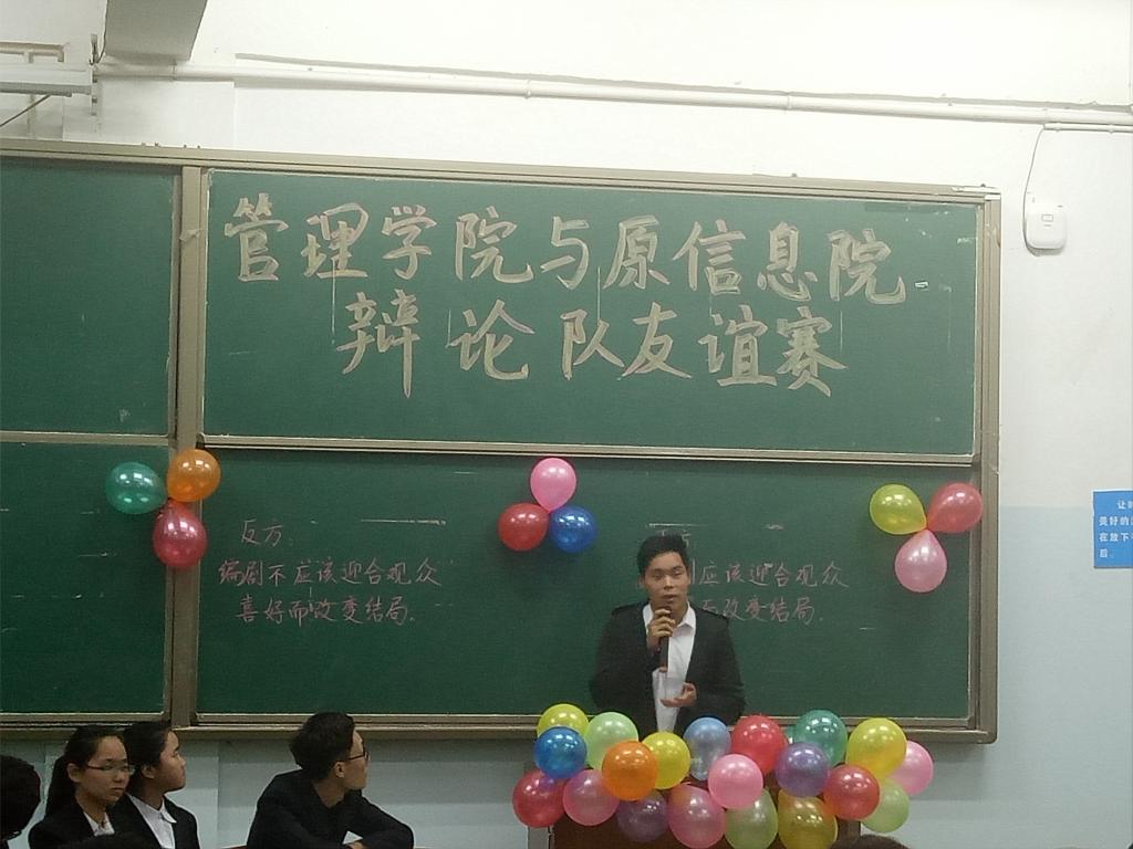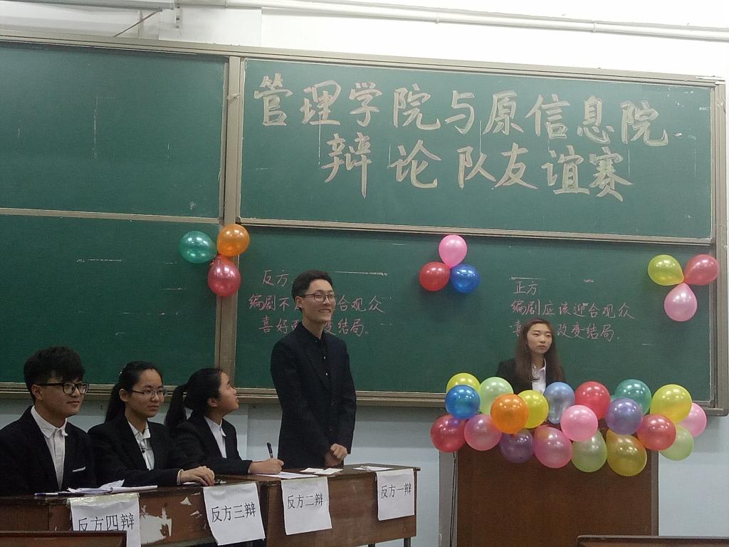 2017年3月12日16:00,由管理学院和信息与电子工程学院学习部共同举办的辩论队友谊赛在一教206教室举行,此次辩论赛有幸邀请到管理学院及信息与电子工程学院主席团成员和辩论队队员担任评委及嘉宾,由管理学院组成的正方辩队和信息与电子工程学院组成的反方辩队通过辩题“编剧应该迎合观众喜好而改变结局”和“编剧不应该迎合观众喜好而改变结局”展开激烈辩论。