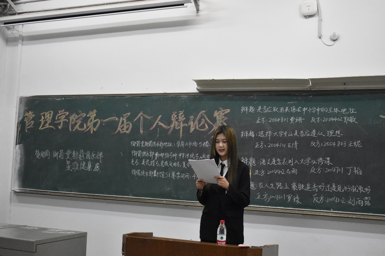 本次个人辩论赛是管理学院的一次尝试,它不仅开拓了大学生的思维眼界,同时也培养了大学生的文化修养。