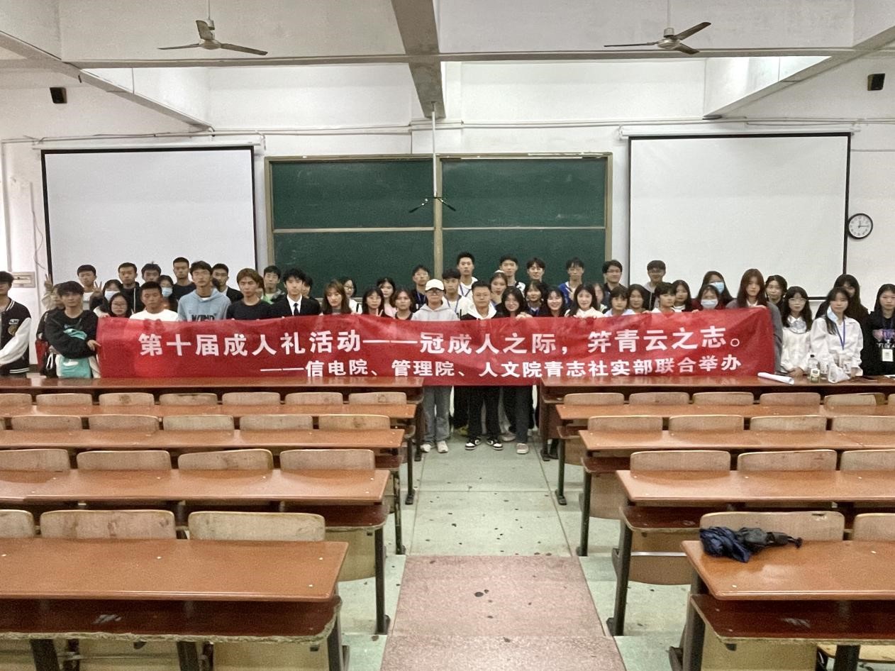 为增强大一新生的成人意识,肩负起对自己、家庭和社会的责任,管理院、信电院、人文院于10月29日上午9时整在一教108教室联合举办了“冠成人之际,笄青云之志”第十届成人礼主题活动。活动由管理院李棋、信电院黄星和人文院李欣茹主持。管理学院团学会主席石潇、团学会全体部长团出席活动,管理院、信电院、人文院全体志愿者按时参加。