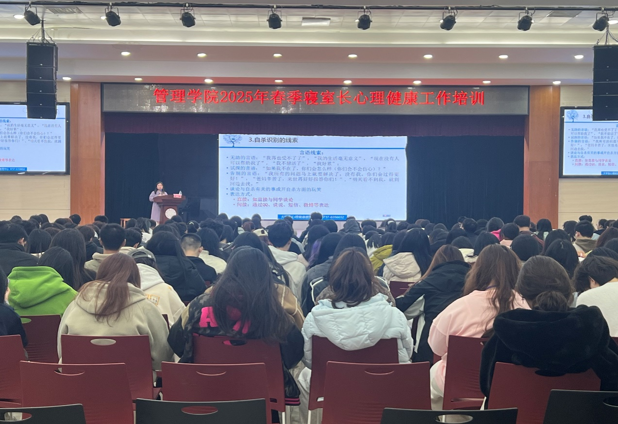 本网讯(通讯员 鄢梦玲 陈姝琪) 为进一步加强学生心理健康教育,提升寝室长在心理健康工作中的专业能力,管理学院于2025年3月16日晚19时整在新食堂三楼活动中心开展寝室长心理健康工作培训。此次培训由管理学院学工办辅导员鄢梦玲老师主持,邀请了大学生心理健康教育中心王晖老师担任主讲嘉宾,管理学院全体寝室长参加培训。