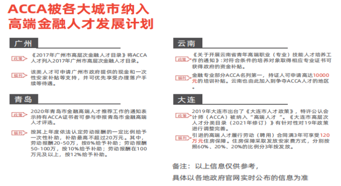 ACCA持证人可享受全国23个省市推出的30余项人才优惠政策,涵盖现金奖励(最高达50万元)、积分落户、安家补贴等核心福利,北京、上海等一线城市及长沙、武汉等新一线城市均将ACCA人才纳入重点引进目录;在"一带一路"倡议推动下,伴随企业国际化进程加速,ACCA持证者已成为各行业竞相争夺的稀缺人才,职业发展空间持续扩容。