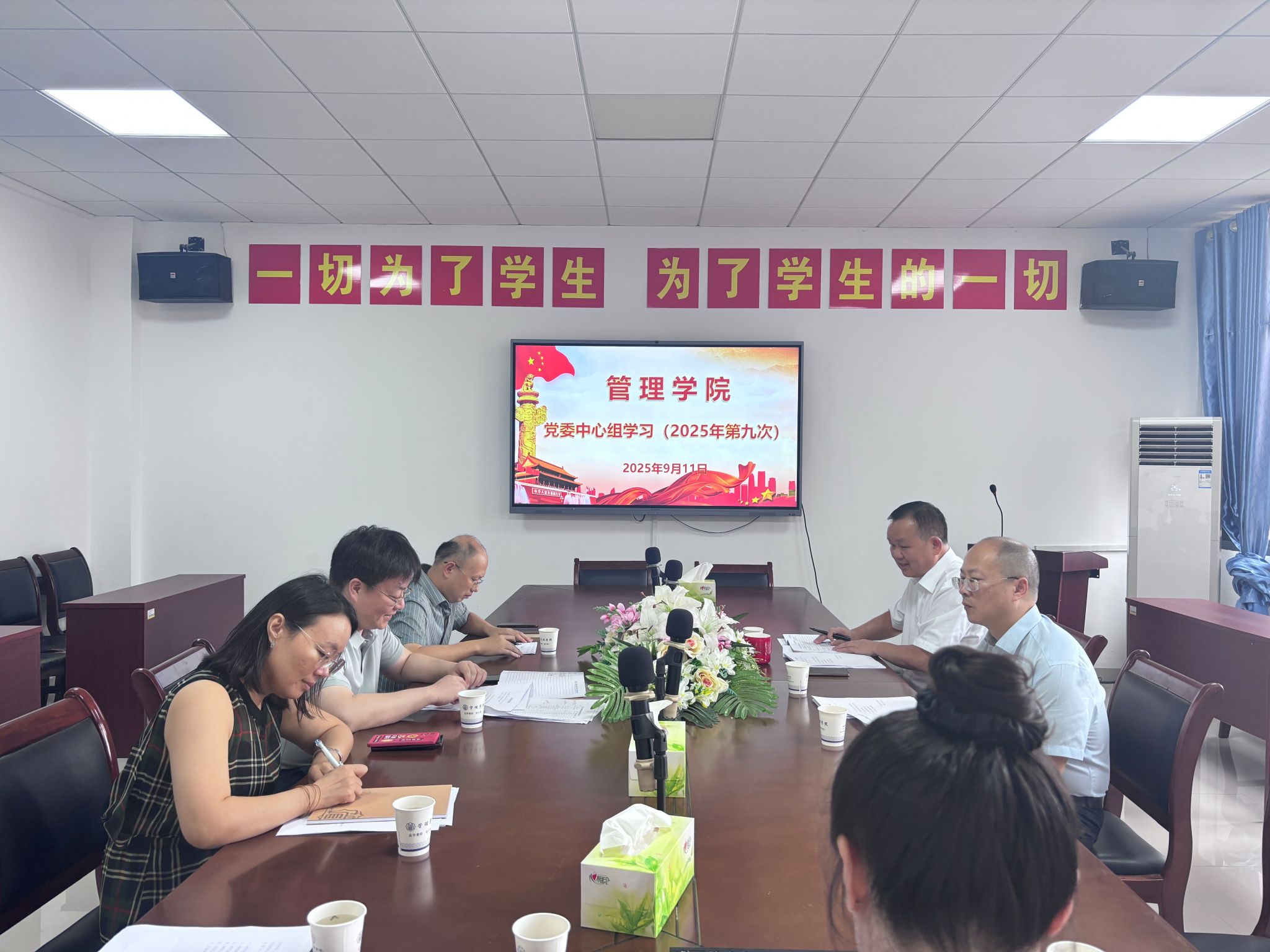 (通讯员:李姗)2025年9月11日上午,学院党委理论中心组在管理楼622开展了集中学习,学习由党委书记王正安主持,中心组成员参加了此次学习。