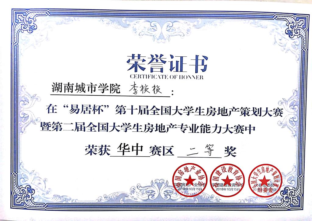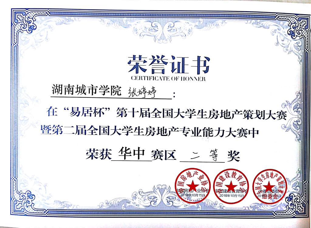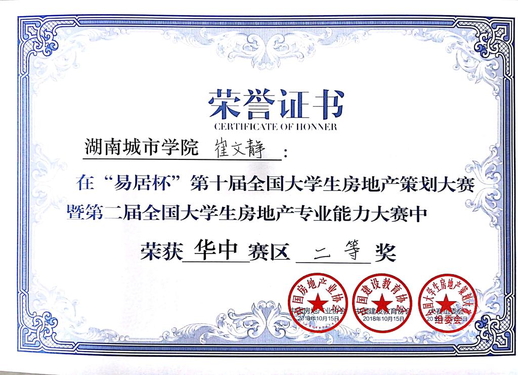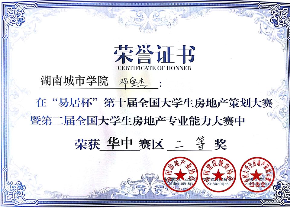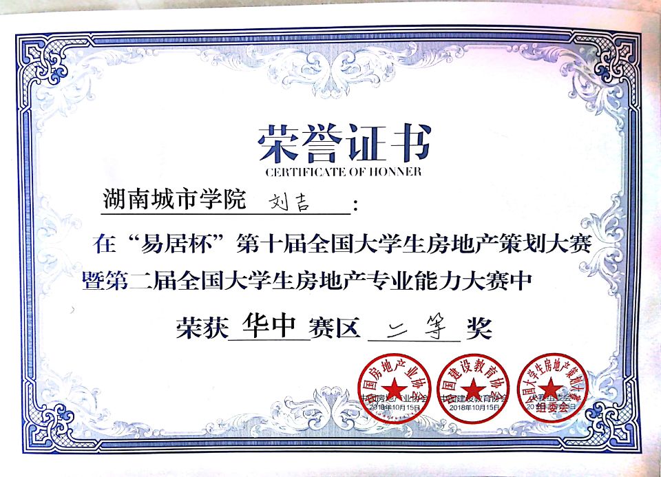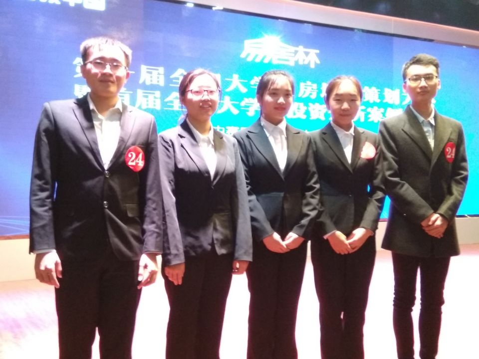 20181015日至16日,“易居杯”第十届全国大学生房地产策划大赛华中赛区在武汉举行本次大赛有170所高校参与,6500名学生报名,全国分七大赛区进行。管理学院郑慧开老师指导的“筑家”团队参加了华中赛区复赛,获得了二等奖,参赛队员为房地产开发与管理专业张婷婷、崔文静(15级)、李祯祯(16级),城市规划专业刘吉(15级)、环境设计专业邓安杰(16级)五位同学。