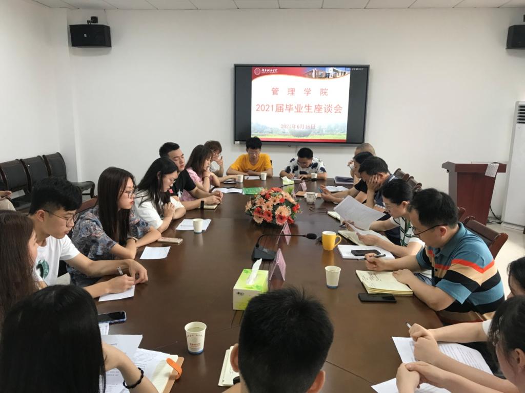 6月16日上午10:30,管理学院在管理楼622室召开 2021届毕业生座谈会。管理学院党委书记徐习军、院长孙倩、副院长赵旭、党委副书记王润华、分管教务工作领导杜林远、学工办主任王方俊、党政办主任周晔、毕业班辅导员李姗、陈再师、张力以及毕业生代表13人参加了此次会议。会议由管理学院院长孙倩主持。