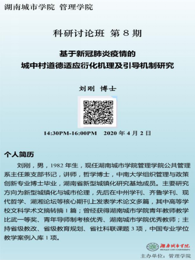 本次科研讨论班邀请了华体会在线(中国)唯一官方网站学科建设与发展规划处副处长汤勇教授主持,学院院长孙倩教授、科研副院长赵旭教授及管理学院教师共23人参加。本次科研讨论班由“城乡治理与工程管理”团队负责人任国平博士组织,“行政伦理与公共管理”团队负责人刘刚博士主讲。刘刚博士结合当下疫情和自身研究方向,选择《基于新冠肺炎疫情的城中村道德适应衍化机理及引导机制研究》为主题,探讨新冠肺炎疫情下城中村居民道德适应的范式转化、衍化机理,为新冠疫情下的城中村居民城市适应进行慎的伦理反思和道德辩护。讲座期间管理学院多位老师就刘刚博士的研究问题进行了积极的讨论,取得了很好的反响。(通讯员:任国平)