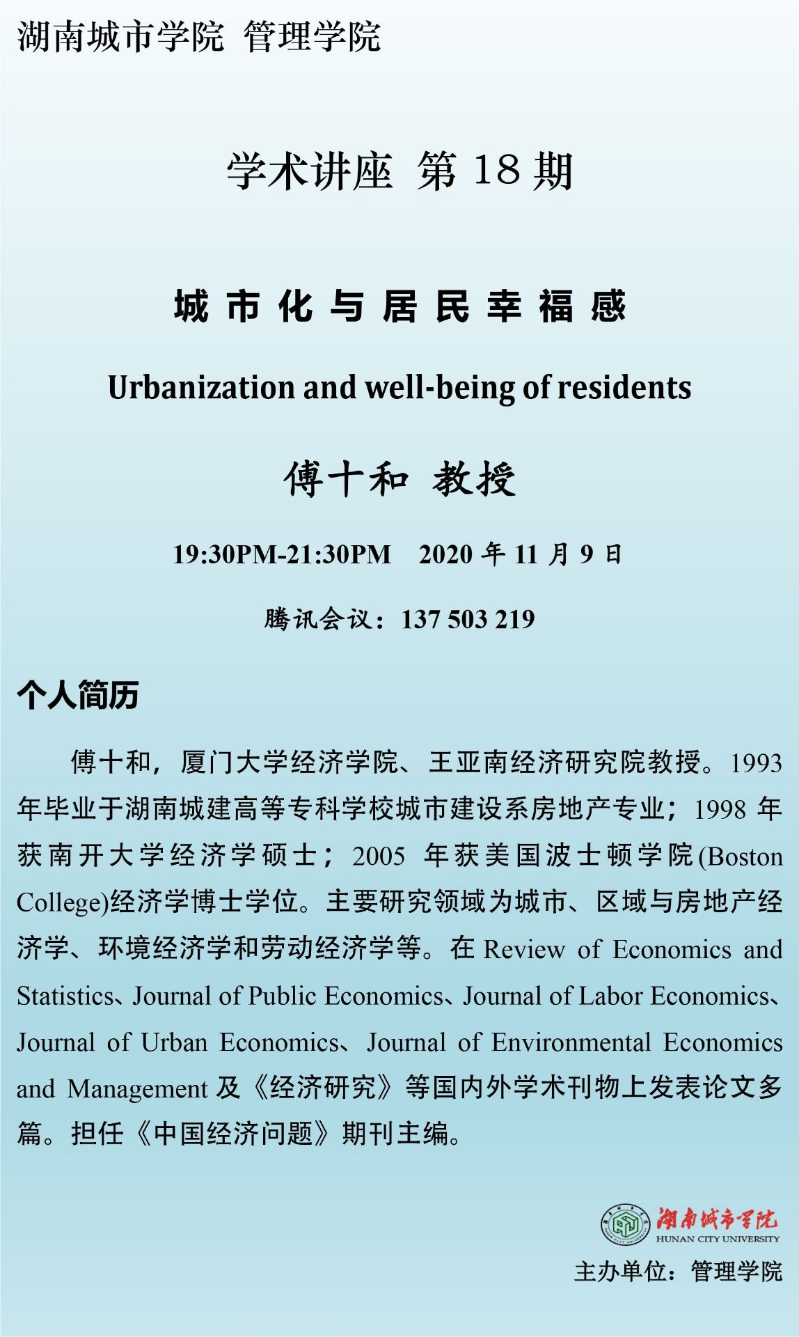 【学术讲座】18傅十和 教授:城市化与居民幸福感