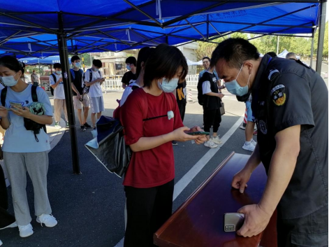 第一个场景为返校学生准备入校,在进校门前接受体温检测、随身行李消毒和健康码、行程码查验时,发现健康码为黄码,安保人员将其带到旁边临时隔离室,详细了解并填写基本信息,同时立即报告学校疫情防控办和相关学院,学校疫情防控办将情况立即报告学校疫情防控领导小组和羊舞岭社区,羊舞岭社区上报赫山区疾控中心后,安排专车接该生到赫山区集中隔离点采取进一步措施,通知学校卫生所协助消杀。