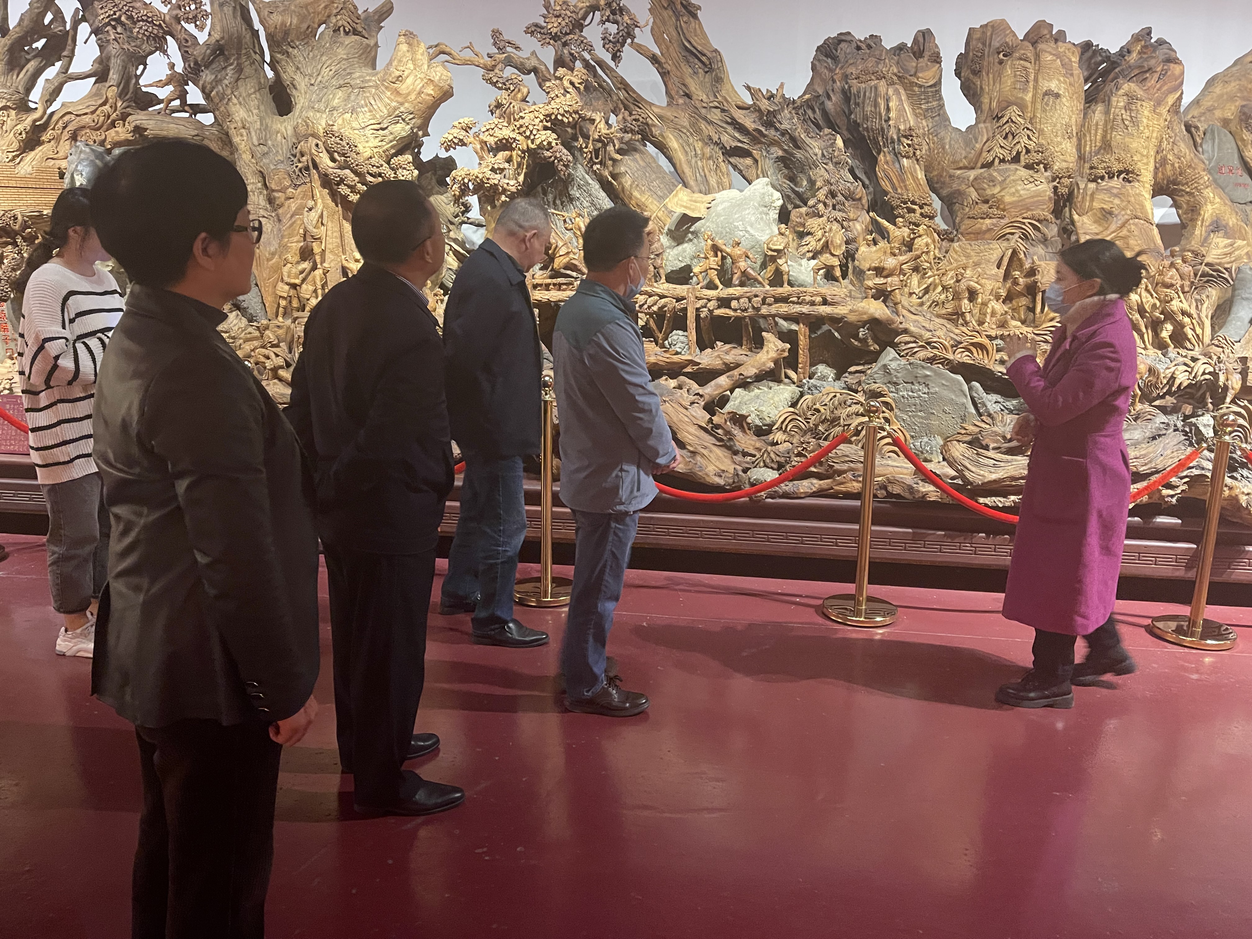 在红军长征根雕文化馆内,大家见到了以“红军二万五千里长征”为主题的大型根雕作品,根雕全长100米,整体气势恢宏,展示了过草地爬雪山、飞夺泸定桥、强渡大渡河等13个长征场景和808位人物的光辉形象,极具红色教育意义和艺术价值。结合这件根雕作品,馆内讲解员给大家生动讲述了红军长征的光辉历史和英雄壮举,大家通过听讲解、观图片、看实物,重温党的光辉历程,追寻红色记忆。